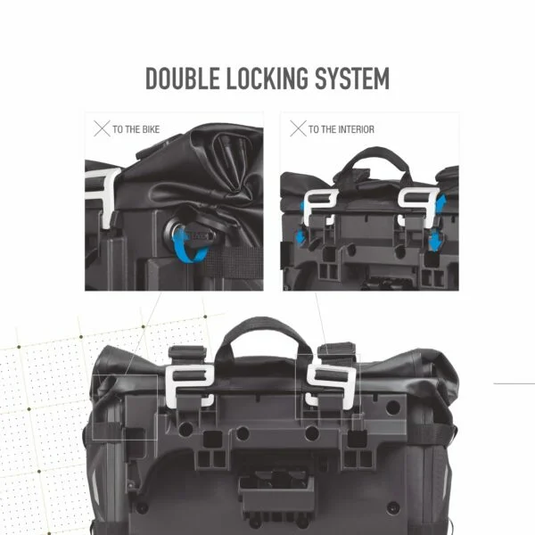 „Sistem dvostrukog zaključavanja“ (patentiran) zaključava torbu na 4P i 3P spojnice i samu torbu, sprječavajući pristup unutrašnjosti.